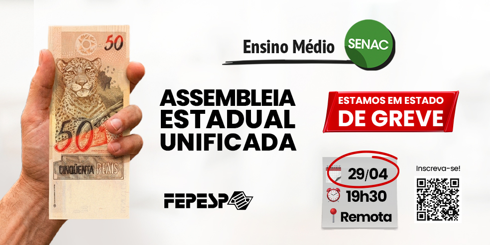 Professores e professoras do Ensino Médio do Senac realizam nova Assembleia Estadual Unificada no dia 29 de abril, às 19h30, em formato remoto.