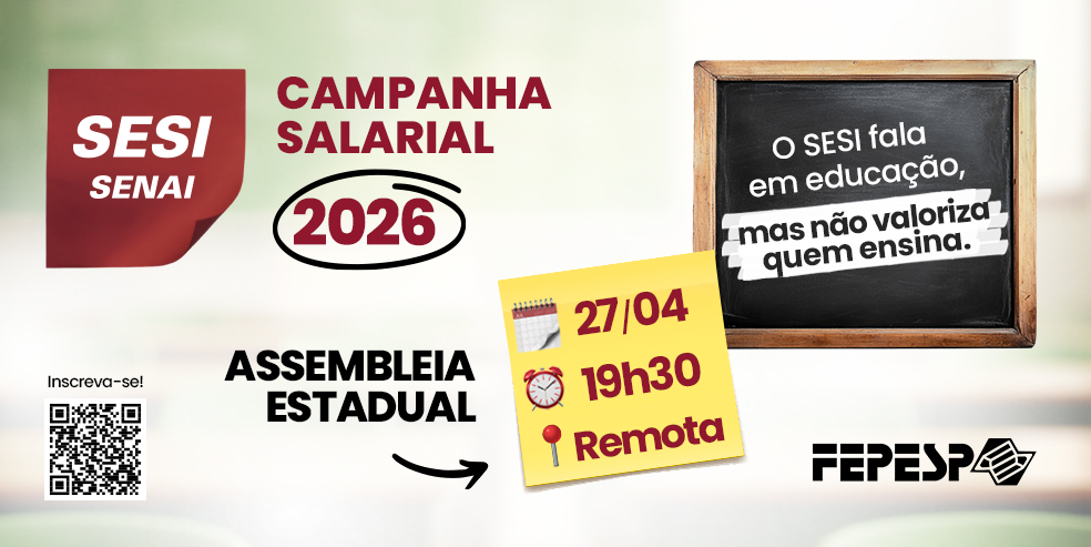 A Fepesp e os Sindicatos da base realizam nesta segunda-feira, 27 de abril, às 19h30, nova Assembleia Estadual Unificada dos professores e professoras do Sesi. O encontro será realizado de forma online e reunirá docentes de todo o estado.